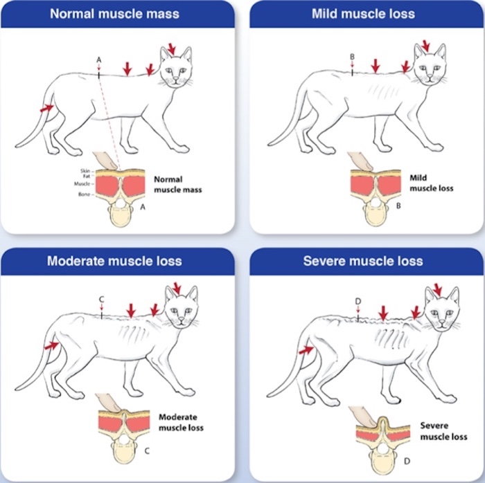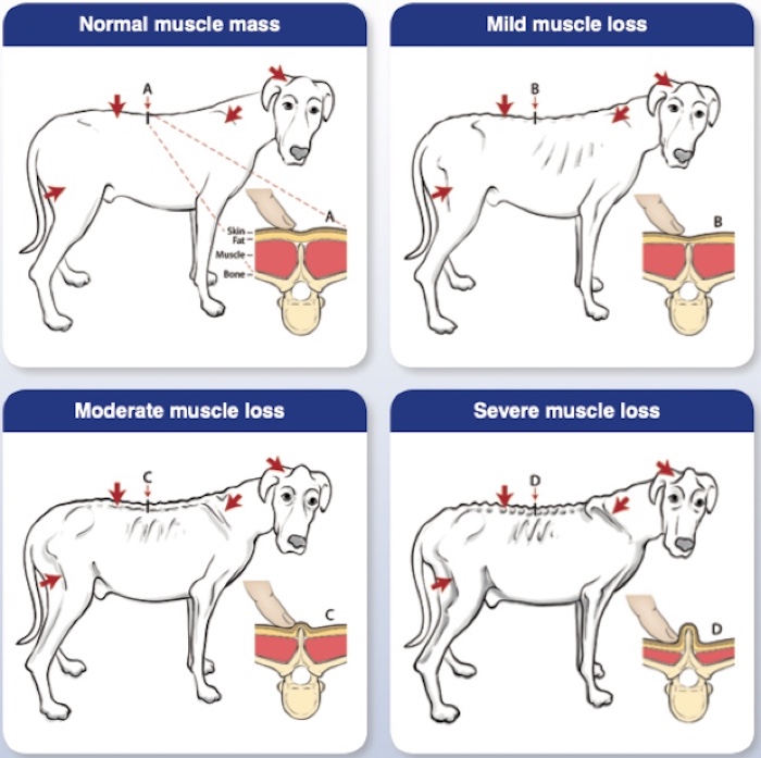La Asociación Mundial de Veterinarios de Animales Pequeños (WSAVA, por sus siglas en inglés) ha creado un manual casero con gráficos sencillos para reconocer cuál es la masa muscular de tu gato o perro, y poder actuar en consecuencia. Primero hay que revisar y palpar su columna vertebral, es la zona donde antes se aprecia la pérdida de músculo. Si las vértebras se marcan a lo largo de todo el lomo, preocúpate. No te fíes de la báscula: un perro con sobrepeso o un gato en su peso ideal también pueden sufrir atrofia muscular.