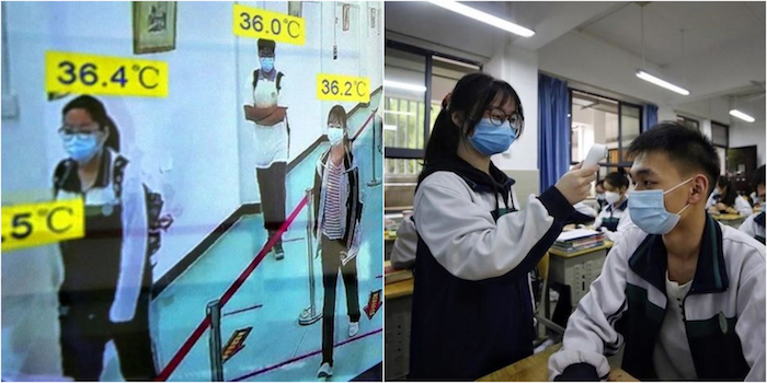 Con uniformes y mascarillas, los estudiantes del colegio Hubei Wuchang Experimental, antes de ingresar a las aulas de clases, debieron pasar por un control de temperatura y una desinfección de sus manos mientras mantenían una distancia de un metro entre ellos.