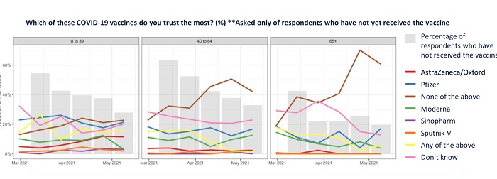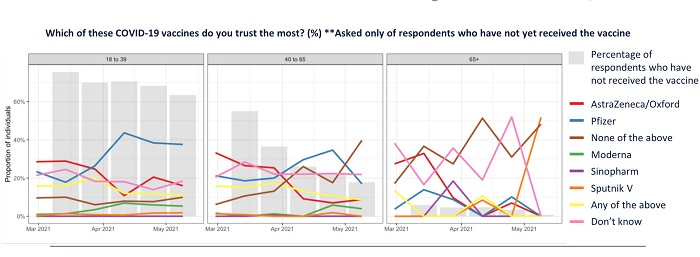 Las excepciones más notables a esta tendencia se encontraron en países con altas tasas de vacunación, a saber, el Reino Unido, Estados Unidos e Israel. La gente en Israel mostró poca preferencia y la mayoría de los menores de 65 años dijeron que confiarían en cualquiera de las marcas enumeradas (AstraZeneca / Oxford, Pfizer, Moderna, Sputnik V y Sinopharm), mientras que la mayor parte de los mayores de 65 dijeron que no confiarían en ninguna de ellas. Los encuestados en los EU mostraron la menor confianza en las diferentes marcas, con la mayor proporción de personas de todas las edades que dijeron que no confían en ninguna de ellas.