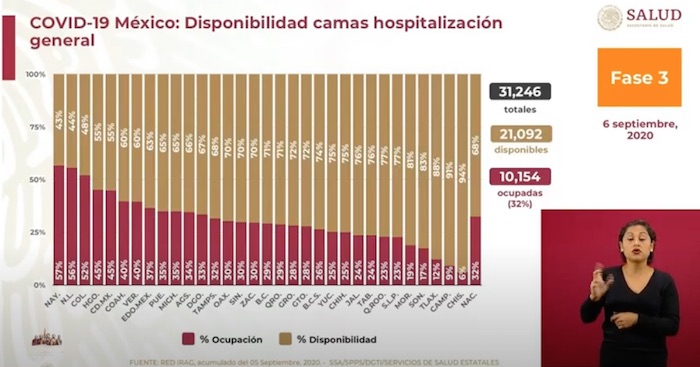 Nayarit es la entidad con mayor ocupación hospitalaria nacional, con el 57 por ciento; le sigue Nuevo León, con el 56; Colima, con el 52; Hidalgo y la Ciudad de México, con el 45 por ciento Coahuila y Veracruz, con el 40 por ciento.