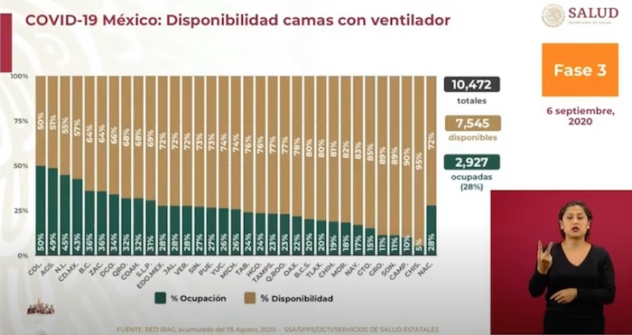 Colima en la entidad con mayor ocupación de camas con ventilador, con el 50 por ciento; le sigue Aguascalientes, con el 49; Nuevo León, 45; Ciudad de México, 43; y Baja California, con el 36 por ciento.