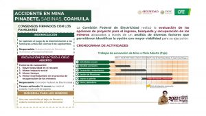 “La CFE realizó la evaluación de las acciones del proyecto para la búsqueda y recuperación de los mineros. Este cronograma nos permite identificar que a seis meses de iniciados los trabajos, con un tajo a cielo abierto, llegarían a las galerías y estaríamos en condiciones óptimas de rescatar a nuestros mineros”, dijo Velázquez.