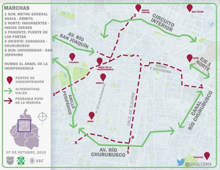 En el sur, la protesta tomará las calles de Tlalpan, Viaducto, Universidad y San Jerónimo. En el oriente, las vialidades de Zaragoza, Viaducto y Churubusco.