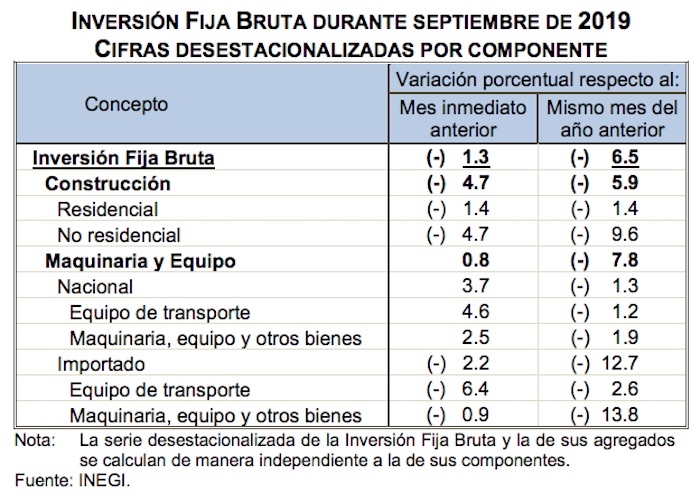 Julio Santaella, director del Inegi, planteó en su cuenta de Twitter que “luego de haber crecido 1.4 por ciento m/m en agosto, la Inversión Fija Bruta cayó (-)1.3 por ciento en septiembre; a su interior la baja provino de la construcción (-4.7 por ciento m/m)”.