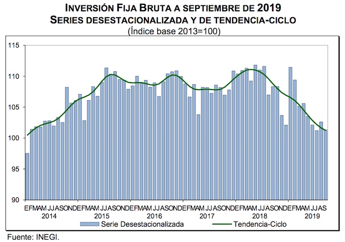 Ciudad de México, 6 de diciembre (SinEmbargo).- En el noveno mes del año la Inversión Fija Bruta (IFB) cayó 1.3 por ciento mensual con lo que perdió la ganancia del mes anterior que estuvo antecedido por tres meses a la baja y volvió a su peor nivel desde abril de 2014.