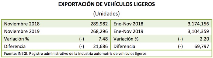 Por su parte, las exportaciones descendieron en 7.48 por ciento acumulando cuatro meses a la baja para sumar 268 mil 296 unidades. De manera acumulada hasta noviembre los envíos de vehículos ligeros de México al extranjero registran una cifra 2.20 por ciento menor a la del mismo lapso del año pasado, con 3 millones 104 mil 359 unidades, frente a 3 millones 174 mil 156 de enero a noviembre de 2018.