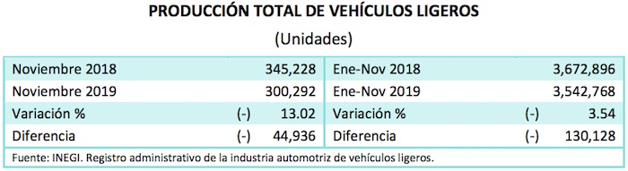 En noviembre la producción de vehículos fue de 300 mil 292 unidades y en el acumulado de once meses que lleva 2019 se han producido 3 millones 542 mil 728 autos. La cifra también fue menor, en 3.54 por ciento, a la sumatoria comparativa con el mismo periodo de 2018.