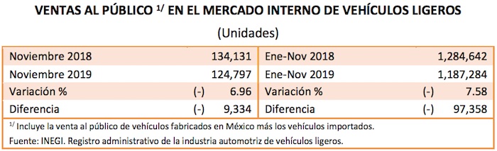 Las ventas descendieron un 6.96 por ciento a tasa anualizada, pues se colocaron 124 mil 797 vehículos frente a los 134 mil 131 de noviembre de 2018.