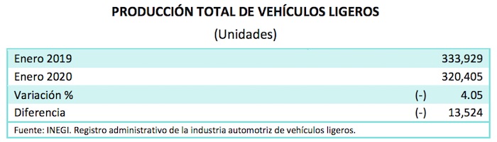 En enero la producción de vehículos fue de 320 mil 405 unidades, menor que los 333 mil 929 del mismo mes de 2019. La caída fue de 13 mil 524 generados en el país.