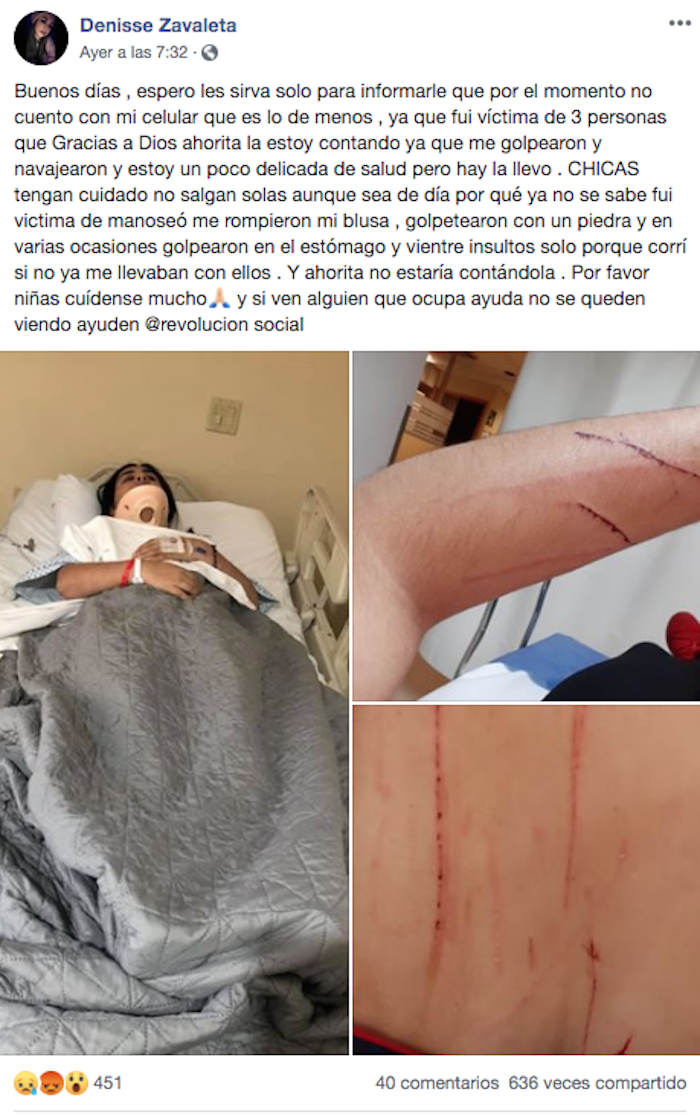 La joven invitó a sus seguidores a apoyar cuando vean que alguna persona solicita ayuda y acompañó su mensaje con tres fotografías, una donde se le observa en una cama de hospital y en otras donde se ven las dos heridas que le hicieron en los brazos.