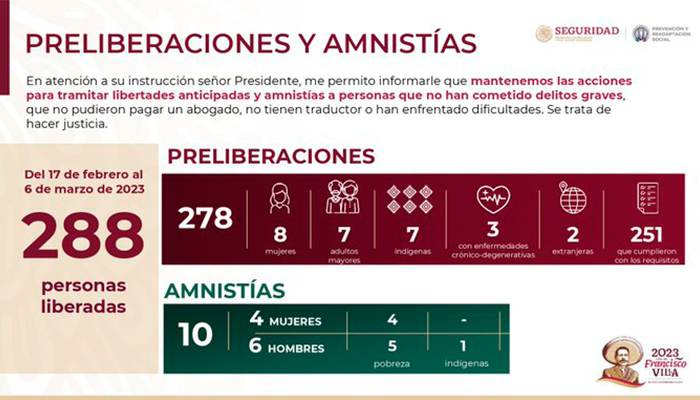 Dentro de las personas preliberadas se encuentran ocho mujeres, siete adultos mayores, siete indígenas, tres personas con enfermedades crónico degenerativas y dos extranjeros. Mientras que de las diez personas con amnistía, cuatro son mujeres y seis hombres.