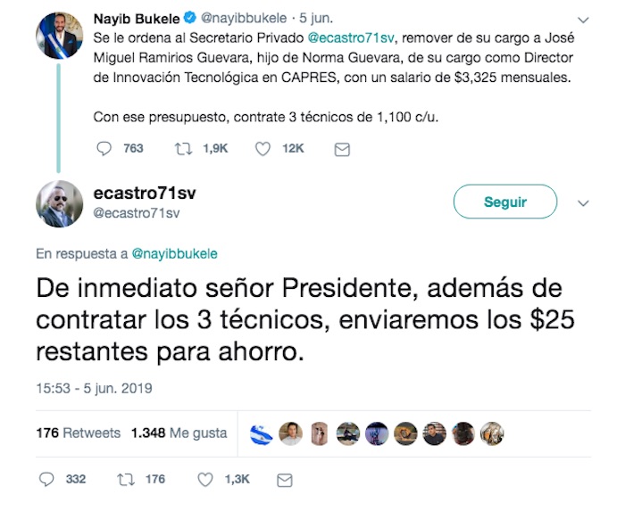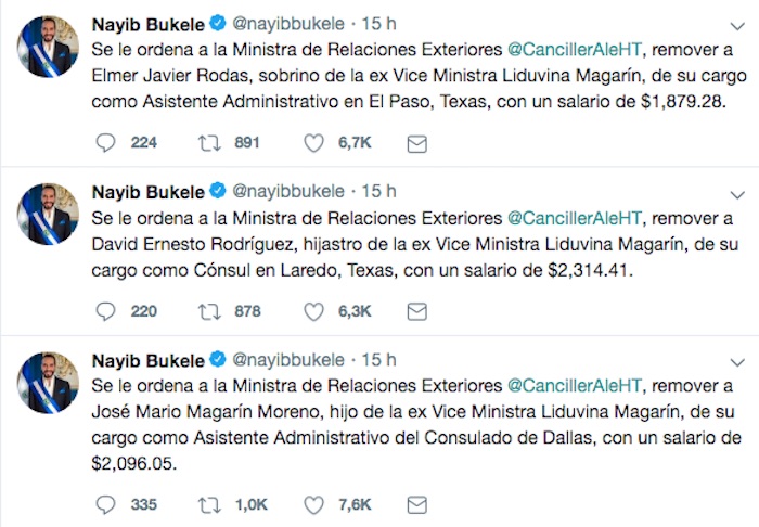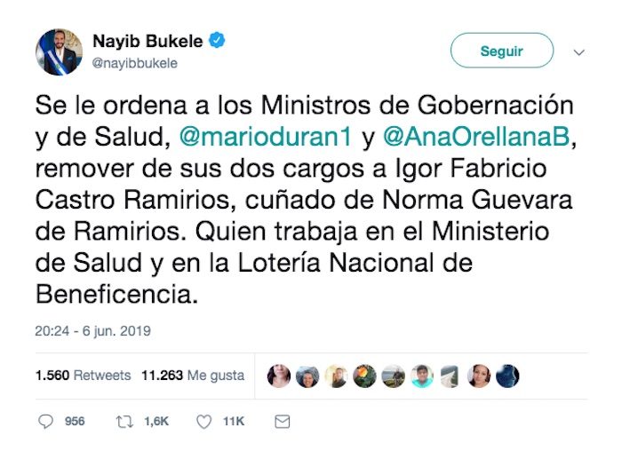 Nayib Bukele ha comenzado a llamar la atención en su país y al exterior por su peculiar manera de gobernar. Esta semana ordenó el despido de una serie de funcionarios que eran familiares del ex Presidente Salvador Sánchez Cerén, todo a través de su cuenta de Twitter. Con tuits ordenó a los ministros de Justicia y Seguridad Pública, Vivienda, y de Trabajo, así como a los directores de dos instituciones gubernamentales, que removieran inmediatamente de sus puestos a dos hijos, cuatro nietos y la nuera de Sánchez Cerén.