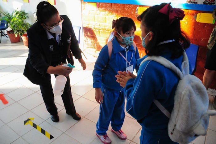 A la entrada de los planteles se colocó un filtro sanitario. A los alumnos que ingresaban se les tomó la temperatura y se les aplicó gel antibacterial.