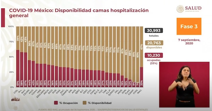 En cuanto a la ocupación hospitalaria de camas generales, esta se ubica en el 33 por ciento a nivel nacional. De los 30 mil 993 espacios disponibles, 10 mil 230 cuenta con un paciente por COVID-19.