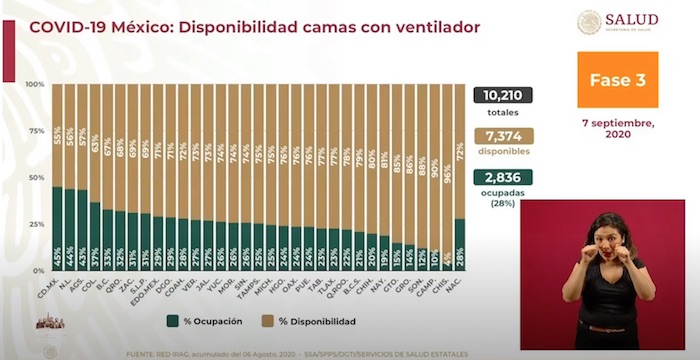 Sobre la ocupación de camas con ventilador, le media nacional se ubica en 28 por ciento. de los 10 mil 210 espacios disponibles, 2 mil 836 cuentan con un paciente con auxiliar respiratorio.
