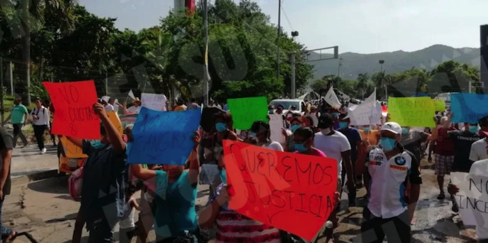 Más de 500 choferes de camiones urbanos, taxis, camionetas Urvan y pasajeras marchan en la avenida Costera, del centro de convenciones en los carriles que van en dirección a La Diana, en el puerto de Acapulco, Guerrero.
