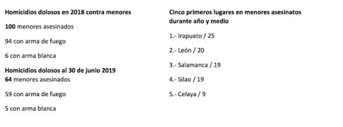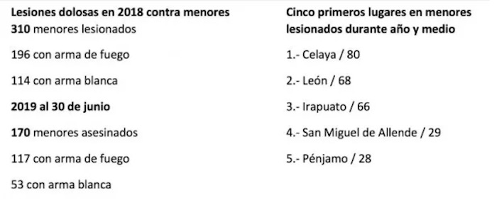 De acuerdo a la estadística que entregó la Fiscalía General del Estado, en una solicitud de información pública, en 2018 se registraron 100 asesinatos de menores en Guanajuato. A estos se suman los 64 que se registraron en el primer semestre de 2019. De esa totalidad, 153 hechos se cometieron con arma de fuego en un lapso de año y medio, y apenas 11 fueron con arma blanca.