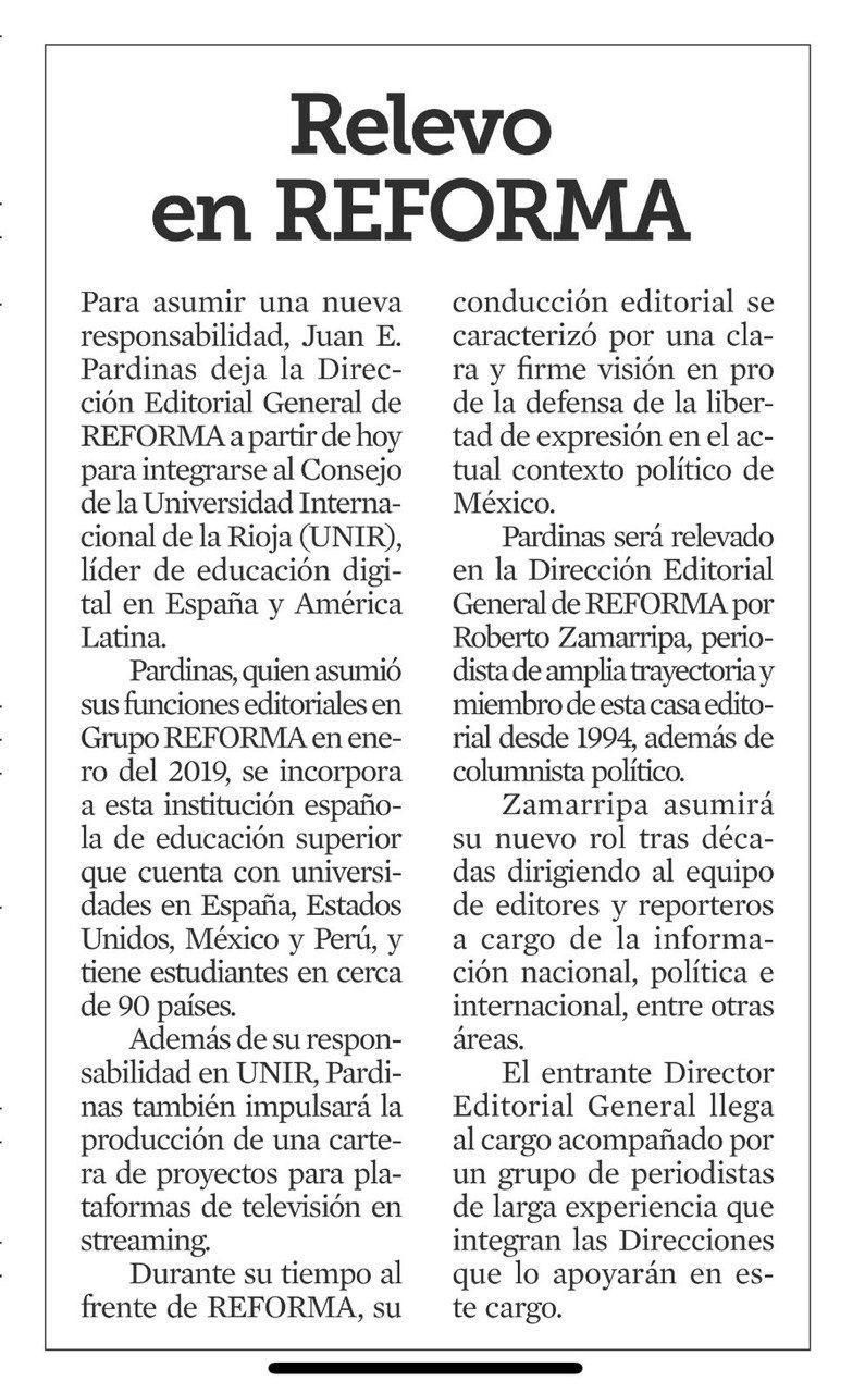 Ciudad de México, 7 de octubre (SinEmbargo).– Juan E. Pardinas dejó la Dirección Editorial General de Reforma este sábado para integrarse al Consejo de la Universidad Internacional de la Rioja (UNIR). Su lugar lo asumirá el periodista Roberto Zamarripa.
