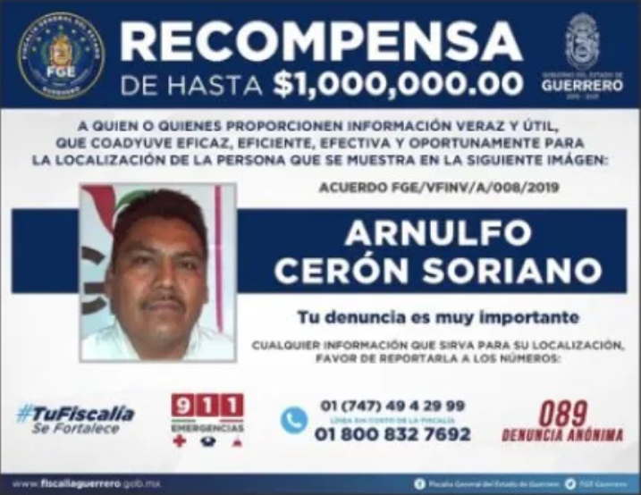 La Fiscalía General del Estado (FGE) ofreció un millón de pesos para quien dé información del paradero del dirigente del Frente Popular de la Montaña (FPM), Arnulfo Cerón Soriano, desaparecido el 11 de octubre cuando salió de su casa para dar una plática en el centro de rehabilitación de la ciudad de Tlapa.