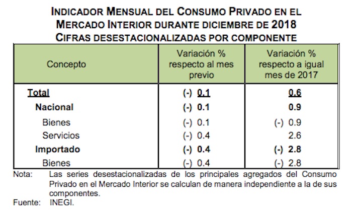 De acuerdo con las cifras publicadas por el Instituto Nacional de Estadística y Geografía (Inegi) este viernes, el consumo de bienes de origen importado retrocedió en 0.4 por ciento y el de bienes y servicios de origen nacional cayó en 0.1 por ciento durante diciembre del año que finalizó.