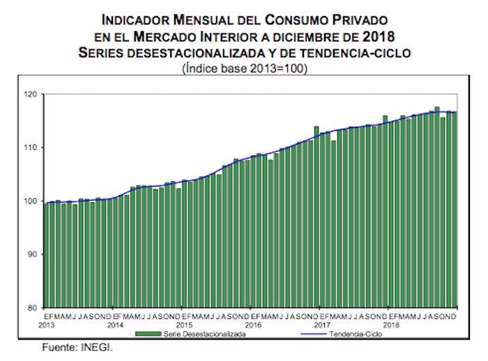 En comparación anual, el consumo privado registró un aumento de 0.6 por ciento durante diciembre, con respecto al mismo mes de 2017.