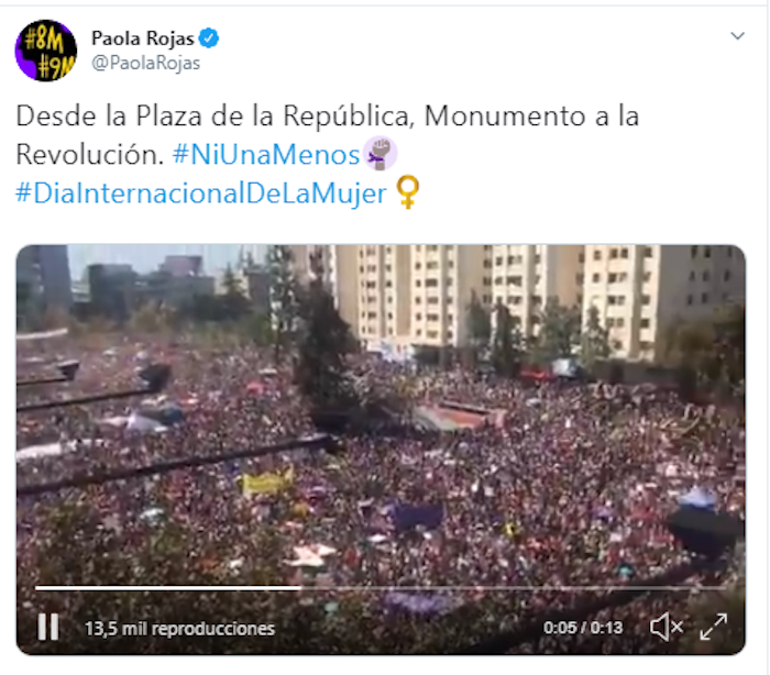 "Desde la Plaza de la República, Monumento a la Revolución. #NiUnaMenos #DíaInternacionalDeLaMujer", escribió y publicó el metraje, sin embargo las respuestas no se hicieron esperar, ya que algunos usuarios se percataron de que las imágenes no eran de México, sino de Alameda, en Chile, por lo que la conductora recibió varias críticas.