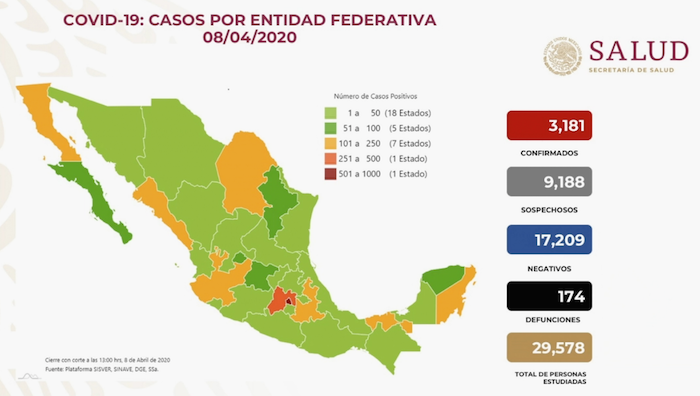 Ciudad de México, 8 de abril (SinEmbargo).– 174 personas enfermas con COVID-19 han muerto en México; 33 en las últimas 24 horas, de acuerdo con información de autoridades de Salud.