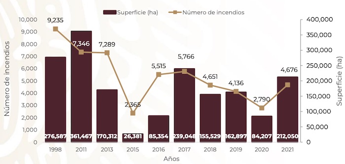 Ciudad de México, 8 de mayo (SinEmbargo).– Cuatro mil 676 incendios forestales se han registrado de enero a abril en todas las entidades del país y han afectado una superficie de 212 mil 050 hectáreas, una cifra que sólo está por debajo de las 361 mil hectáreas siniestradas en el mismo periodo del histórico 2011 y las 239 mil en el 2017, según muestran los datos más recientes de la Comisión Nacional Forestal (Conafor).