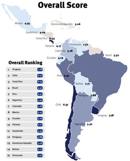 A Uruguay le siguen Chile (6.57), Costa Rica (6.43), Brasil (5,52), Perú (5.47), Argentina (5.32), Colombia (5.18), México (4.55), Ecuador (4.19), Panamá (4.17), Guatemala (4.04), Paraguay (3.88), República Dominicana (3.26), Bolivia (2.71) y Venezuela (1.52).