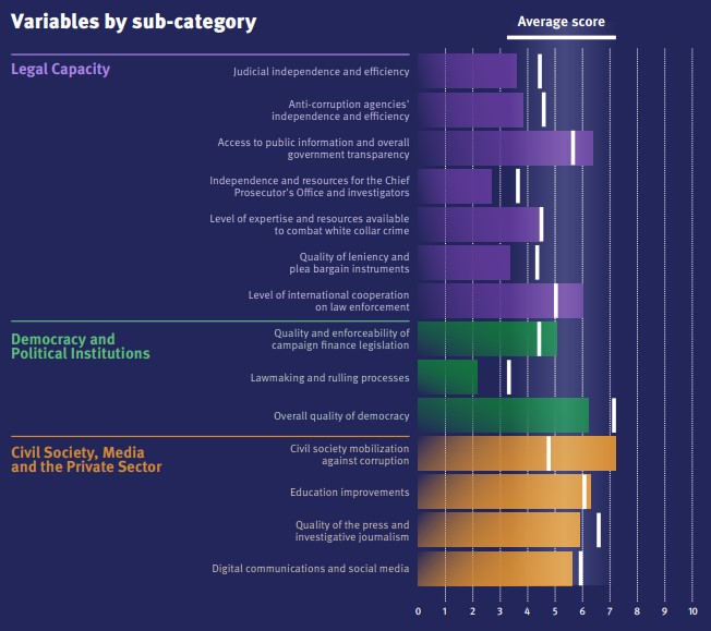 Los indicadores "Capacidad legal", "Democracia e instituciones políticas" y "Sociedad civil, medios y sector privado" se mantuvieron notablemente en un nivel similar al del año pasado.