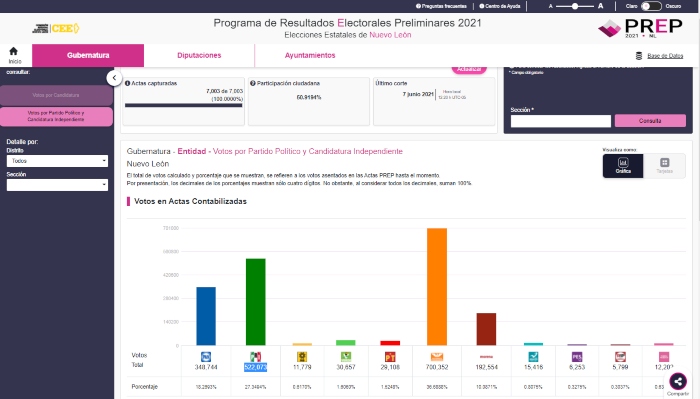 Con el 100 por ciento de las actas capturadas en el Programa de Resultados Electorales Preliminares (PREP), Samuel García, el polémico político de Movimiento Ciudadano (MC), es el virtual ganador de la gubernatura de Nuevo León con 700 mil 352 votos a su favor (36.6 por ciento).