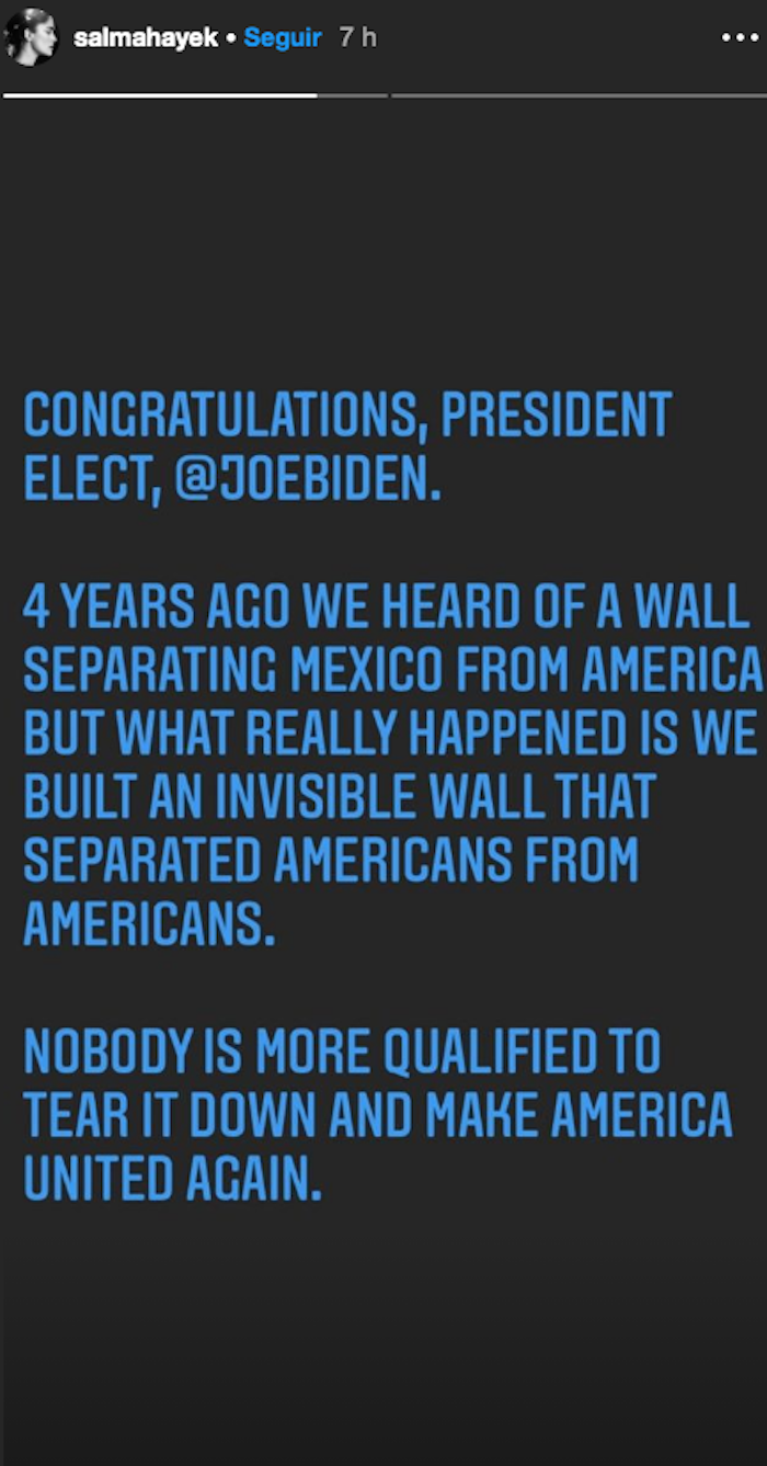 “Felicitaciones Presidente electo Joe Biden. Hace cuatro años escuchamos de un muro separando a México de Estados Unidos. Pero lo que realmente pasó es que construimos un muro invisible que separó a los estadounidenses entre sí. Nadie está más calificado para derrumbarlo y hacer que Estados Unidos vuelva a unirse”, escribió Salma en una de sus stories dedicada a Biden.
