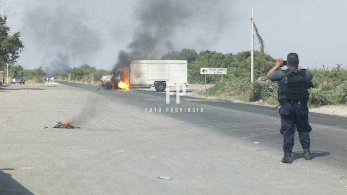 Tras la captura de ‘‘El Greñas'', civiles armados se robaron tres vehículos para atravesarlos en la carretera Apatzingán-Aguililla; les prendieron fuego con el fin de evitar el avance de soldados y agentes estatales quienes buscan a más integrantes de esta organización criminal, presuntamente responsables de los ataques contra policías de Tingüindín, hechos ocurridos hace dos días.