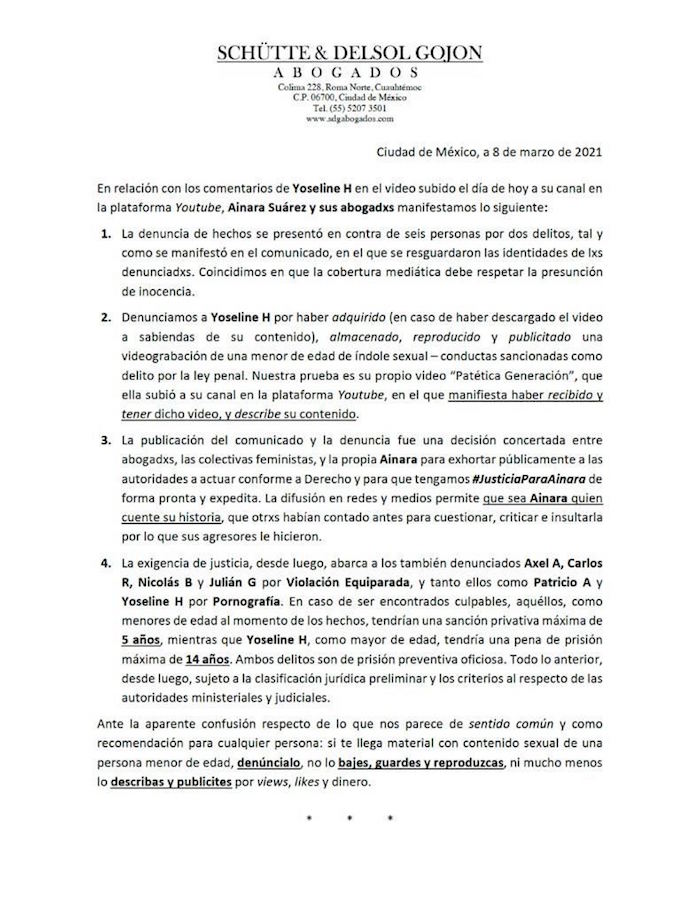 Ciudad de México, 9 de marzo (SinEmbargo).- La defensa legal de la joven Ainara “S” emitió su postura con respecto a los comentarios que la youtuber Yoseline "H", conocida como “YosStop”, emitió ayer, en un video publicado en su cuenta de redes sociales.