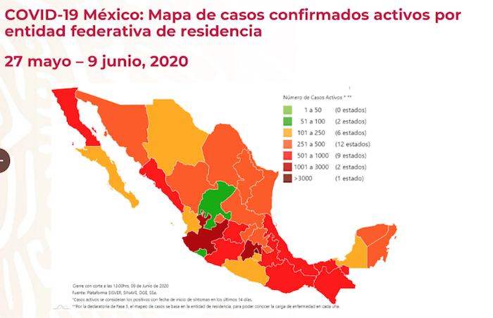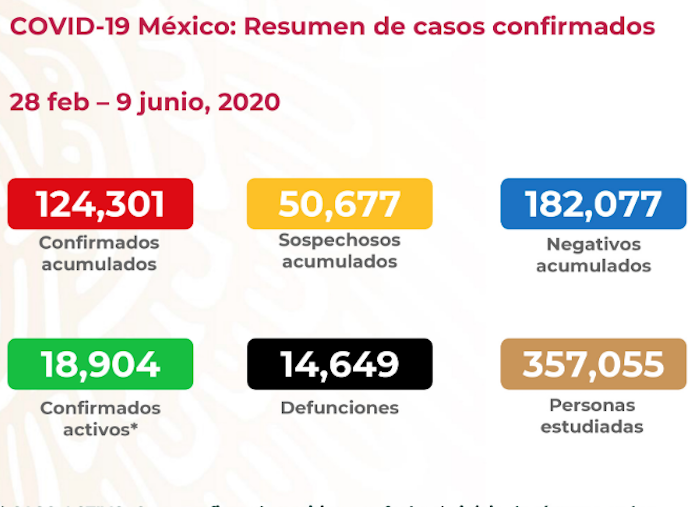 Ciudad de México, 9 de junio (SinEmbargo).– En el día 9 de la nueva normalidad, México reporta 124 mil 301 casos confirmados de COVID-19, de los cuales 18 mil 904 representan la epidemia activa, es decir, los que se confirmaron en los últimos 14 días. En total, 14 mil 649 personas han muerto en el país por la enfermedad.