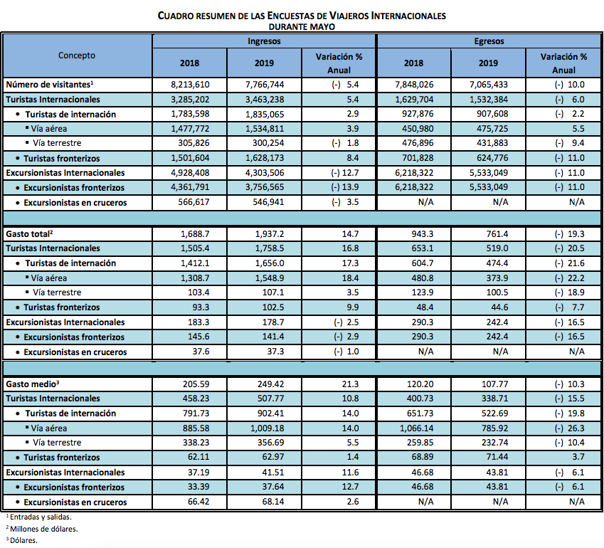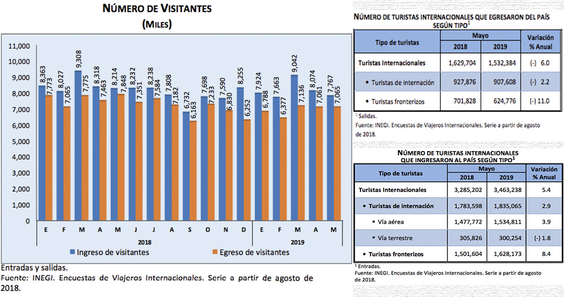 En el caso de los turistas de internacionales, se observó durante el quinto mes de este año un avance a tasa anual de 2.9 por ciento: los turistas que ingresaron vía aérea se incrementaron 3.9 por ciento y los que lo hicieron por tierra descendieron 1.8 por ciento.