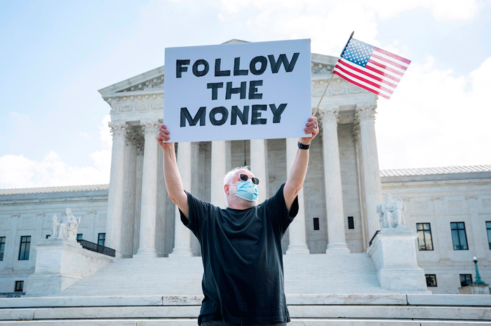 Bill Christeson protesta afuera del Tribunal Supremo de EU antes de que se pronuncien sobre dos casos que buscan adquirir los registros financieros del presidente Donald Trump, incluidas sus declaraciones de impuestos. Foto: Lo Scalzo, EFE