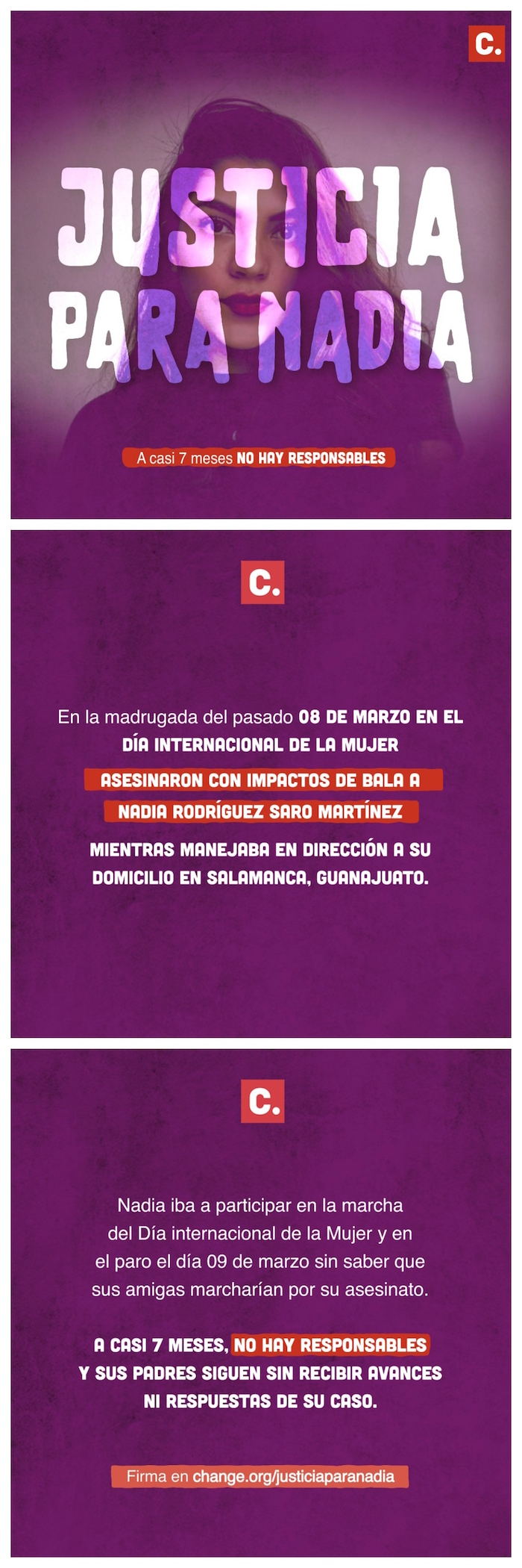 “Un día antes de su brutal asesinato, Nadia participó en su escuela en un ejercicio de concientización sobre la violencia a la mujer y escribió una carta a sus padres y a su hermano mayor en caso de que fuera una cifra más de desaparición o feminicidio (…) Nadia iba a participar en la marcha del Día internacional de la Mujer y en el paro el día 09 de marzo sin saber que sus amigas marcharían por su asesinato”, indica la reseña adjunta a la solicitud en Change.org.