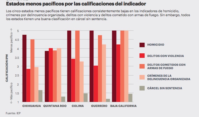 El Índice de Paz, que se elabora tomando en cuenta distintos factores como los homicidios, los delitos con violencia, los delitos que se cometen con armas de fuego, la cárcel sin sentencia y los crímenes relacionados con la delincuencia organizada, arrojó que de los cinco estados menos pacíficos todos empeoraron su calificación en 2018.