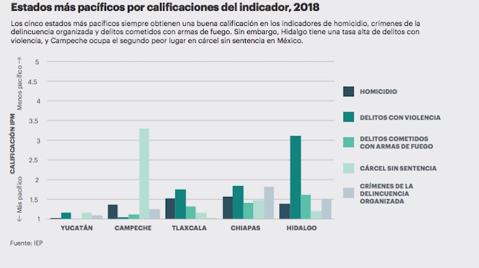 De acuerdo con el Índice de Paz 2019, los niveles de violencia más altos se sitúan en los estados de Baja California seguido de Guerrero, Colima, Quintana Roo y Chihuahua. En contraste, las cinco entidades más pacíficas son Yucatán, Campeche, Tlaxcala, Chiapas e Hidalgo.