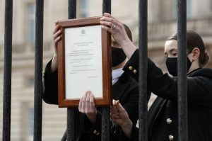 Personal del Palacio de Buckingham coloca un anuncio oficial de la muerte del príncipe Felipe en la entrada, en Londres, el viernes 9 de abril de 2021. Felipe, el esposo de la reina Isabel II, tenía 99 años. Foto: Matt Dunham, AP.