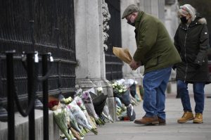 Un hombre deja un ramo de flores en la puerta del Palacio de Buckingham, en Londres, el 10 de abril de 2021, un día después de la muerte del príncipe Felipe, el marido de la reina Isabel II. Foto: Alberto Pezzali, AP.
