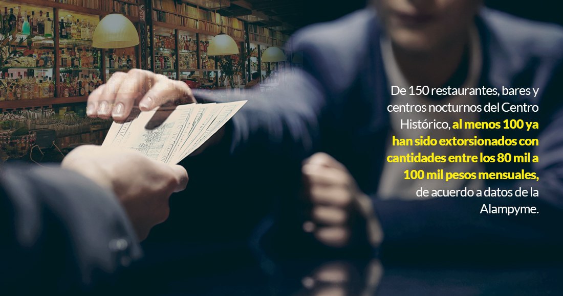 Ejemplificó que tan sólo en el Centro Histórico, de 150 restaurantes, bares y centros nocturnos de alto impacto, es decir, que tienen una entrada de capital interesante, al menos 100 ya han sido extorsionados con cantidades entre los 80 mil a 100 mil pesos mensuales para no tener ningún altercado.