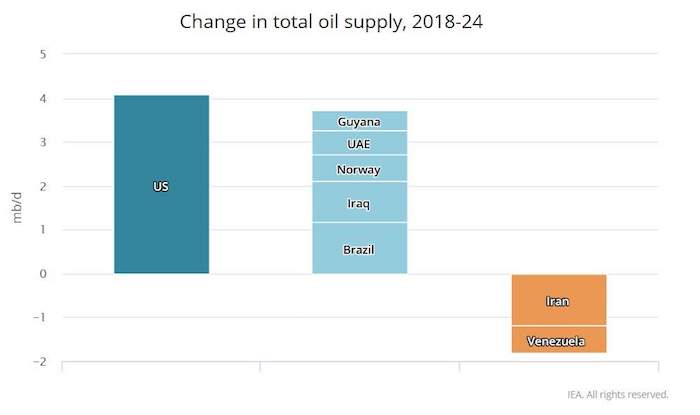 En concreto, la agencia aventura que sin cambios en las condiciones del embargo, Irán se quedará estancado en los 3.85 millones de barriles diarios en los cinco años de la previsión, mientras que Venezuela caerá de los 1.31 millones de 2018 a 0.75 en cada uno de los cinco ejercicios siguientes.