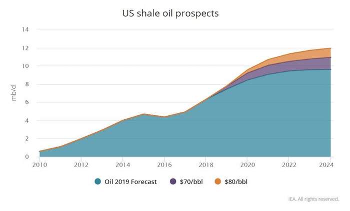 En su informe de perspectivas a cinco años, la AIE contempla que la producción petrolera de Estados Unidos, que tuvo un incremento récord de 2.2 millones de barriles en 2018, va a seguir siendo la protagonista en los próximos años y aportará el 70 por ciento de la producción adicional de todos los productores en detrimento de la OPEP, que durante décadas se ha mantenido como el señor mundial del petróleo.