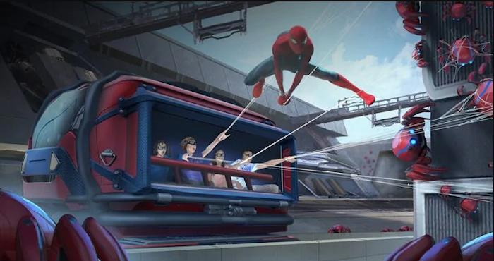 Con ese objetivo en mente se creó “WEB SLINGERS: A Spider-Man Adventure”, que usa una combinación de imágenes físicas y digitales para permitir que los visitantes viajen cual Hombre Araña con Peter Parker en la pantalla. La atracción comienza en una casa abierta donde Spider-Man (interpretado por Tom Holland) muestra unas arañas robot pequeñas pero poderosas que él y un equipo de adolescentes creativos conocidos como la Brigada Mundial de Ingeniería, o WEB por sus siglas en inglés, desarrollaron en un viejo edificio donado por Tony Stark. Por supuesto que los robots, capaces de autorreproducirse, se salen de control y comienzan a invadir el lugar, y los visitantes son llamados a ayudar a capturarlos.