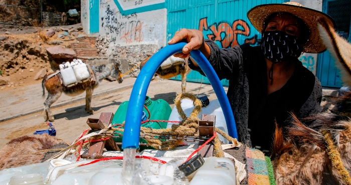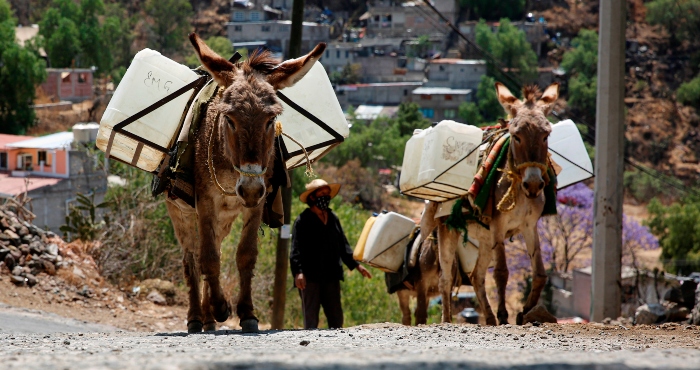 El acceso al agua para las familias de Santa Cruz Acalpixca, solo es a través de la que las personas como Estela que llevan en sus burros tras acarrear el líquido de un pozo que está a unos 15 minutos del barrio.