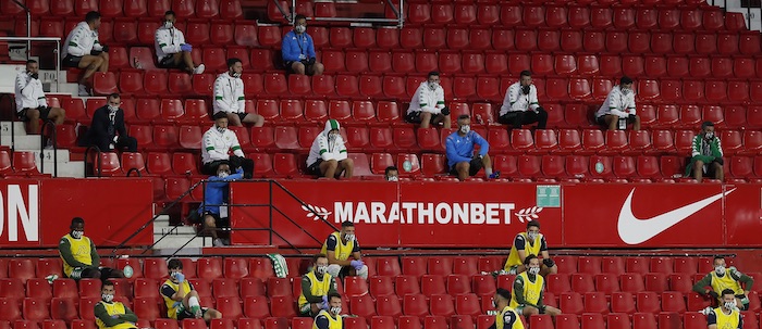 Jugadores reservas y el cuerpo técnico del Betis, siguen desde la grada y respetando el espacio de seguridad. Foto: EFE