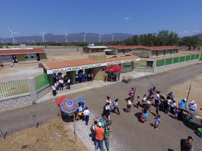 En mitad de los aerogeneradores llama la atención la escuela Ignacio Allende, también en el municipio de Santo Domingo Ingenio.