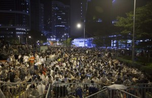 . Hong Kong (China), 28/09/2014.- Student protestors man the barricades at an overnight mass sit-in in front of Hong Kong's Central government offices, Hong Kong, China, 28 September 2014. It was announced at the student protest that the society-wide mass disobedience campaign, Occupy Central would commence immediatley - three whole days earlier than was previously forecast. The students and the Occupy Central supporters are protesting the slow pace of democratic reform imposed by the Chinese government on the Hong Kong people. (Protestas) EFE/EPA/ALEX HOFFORD